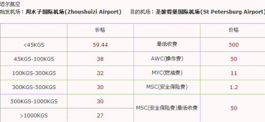 2、到市场信息网站的“运价”页面,在空运航线中查询周水子国际机场到圣彼得堡国际机场的运价,选择其中报价最低的迈尔航空,价格画面如下图: