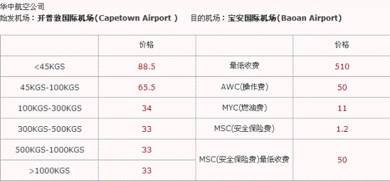 2、到市场信息网站的“运价”页面,在空运航线中查询开普敦国际机场到宝安国际机场的运价,选择其中报价最低的华中航空,价格画面如下图: